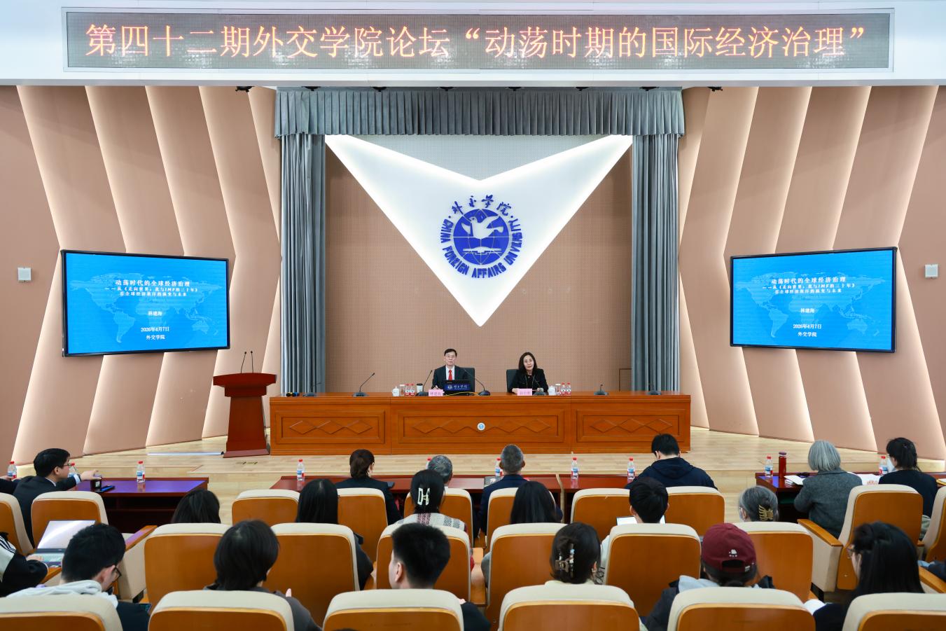 2026年4月7日下午,第42期“外交学院论坛”邀请国际货币基金组织(IMF)前秘书长、外交学院名誉教授林建海博士来校做“动荡时代的全球经济治理——从《走向世界:我与IMF的三十年》看全球经济秩序的演变与未来”专题讲座。