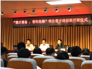 2018年5月30日14时,各院系班干部在行政楼二楼汇报厅进行了“德才兼备,青年先锋”学生骨干培训班开班仪式。